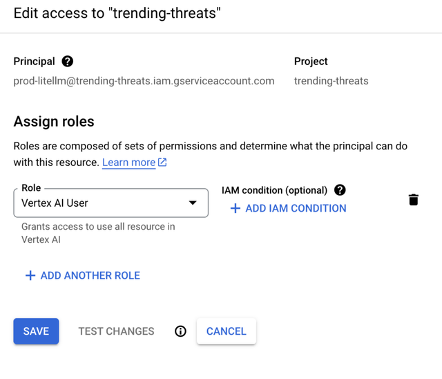 - Specify the Service Account as the principal and Vertex AI User as the role